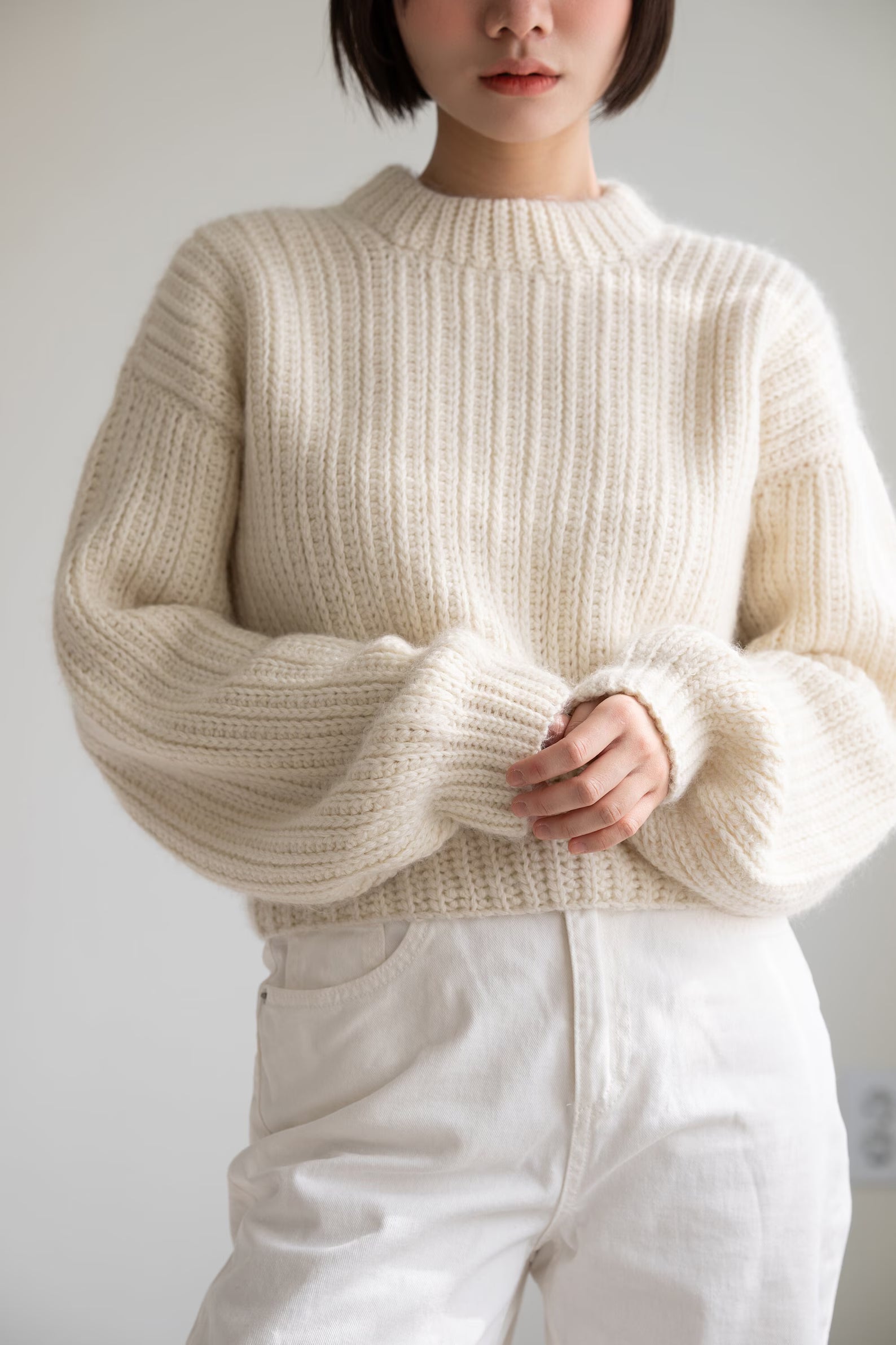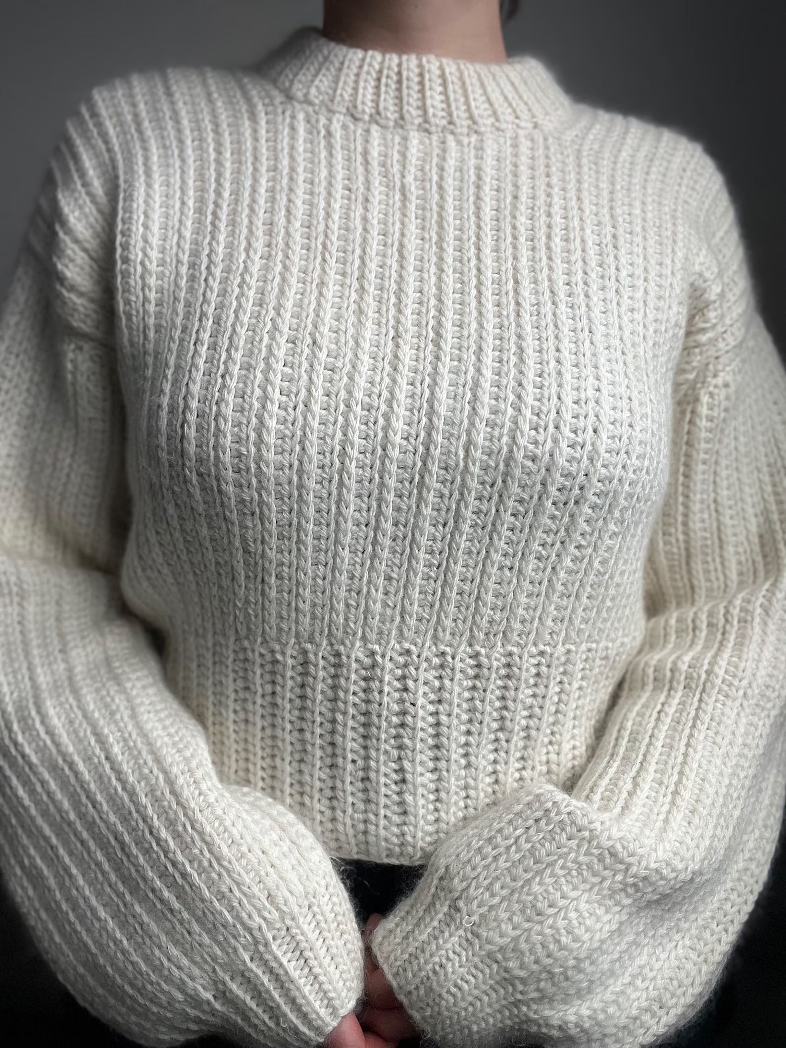 This beginner-friendly, size-inclusive pattern guides you through creating a chic, double-folded collar, thick bottom ribbing, and classic knit-like stitches.
